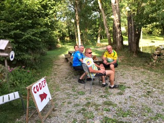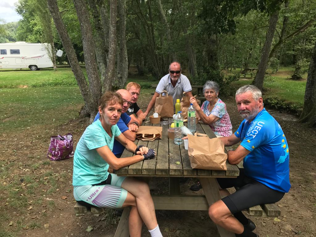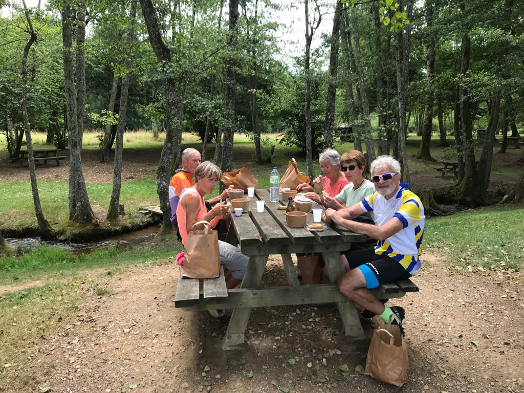 Des températures moins élevées étant annoncées pour le dimanche, nous convenons de ne partir qu’à 8h00, le petit déjeuner n’étant servi qu’à 7h30. Mauvais présage, pour cette longue étape vallonnée, dès la fin de matinée nous nous retrouvons sur une route très abîmée avec des ornières dans le bitume dues à la chaleur et passage de camions faisant penser au travail de sangliers sur les bermes. la fatigue commença à se faire sentir après le col du Maupuy 631 m, le 1er de notre séjour, après la pause déjeuner nous ne manquions pas de volontaires pour prendre en charge le véhicule.