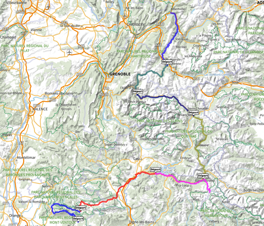 Débutant par le Mont Ventoux, quelques grands cols vous attendent ensuite, avec des distances et dénivelés mesurés.